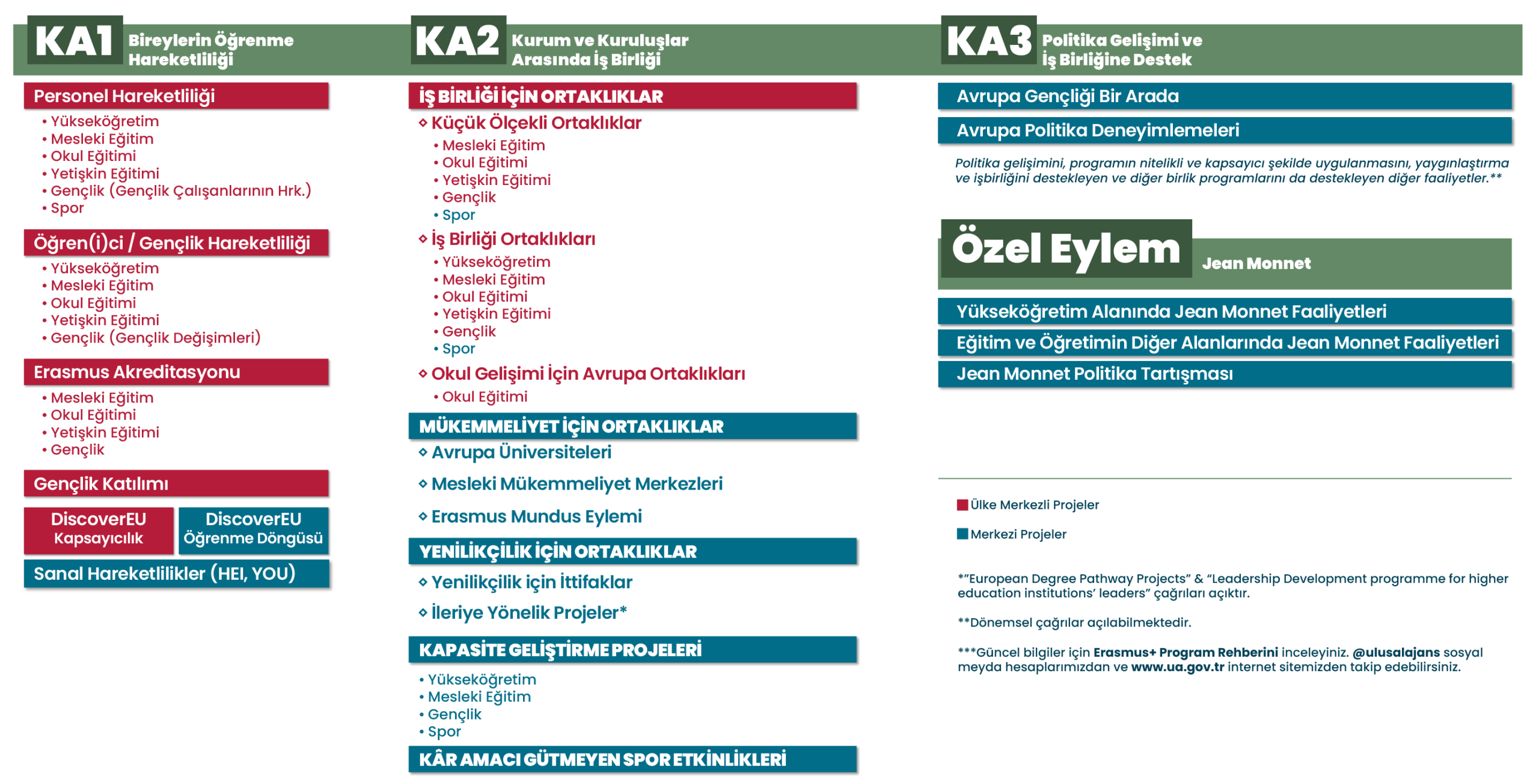 Erasmus+ Programı kapsamında desteklenen faaliyetler temel olarak 3 Ana Eylem (Key Action, KA) ve 1 Özel Eylem altında toplanmaktadır.